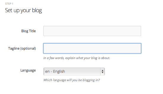 Size gelen doğrulama mailini onayladıktan ve aktif ettikten sonra karşınıza aşağıdaki ekranda görülen alan gelecek. Bu alan içerisinde Blog Title (Blog Başlığı) alanına bir başlık girin. Tagline (Etiket) alanı opsiyonel fakat burayada ilgili bir açıklama girmekte fayda var. Örnek olarak site başlığınızı Tasarım Dünyası olarak verdiğinizi düşünürsek etiket alanına da En son tasarım haberleri demeniz bloğunuz için oldukça faydalı ve açıklayıcı olacaktır. Yine bu alandaki son seçiminiz Language (Dil) ayarı olacak. Yayın yapacağınız dilide seçtikten sonra bir sonraki adıma geçiyoruz.