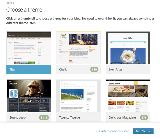 En önemli adım olan blog temanızın seçim ekranındayız. Beğendiğiniz bir temayı seçerek devam edebilir ya da daha sonra karar vermek üzere aşağıdaki “Skip for now” linkine tıklayarak devam edebilirsiniz.
