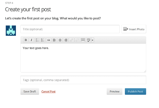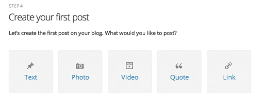Temanızı seçtikten sonra WordPress.com sizi ilk blog haberinizi girme alanına yönlendirecek. Bu alanda karşınızda bir seçim ekranı olacak. Seçenekleriniz arasında Text (Düz Metin), Photo (Fotoğraf), Video (Video), Quote (Alıntı) ve Link (Bağlantı) yer almakta. Düz bir metin gireceğiniz varsayalım ve Text seçeneği ile devam edelim.